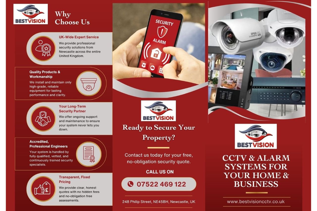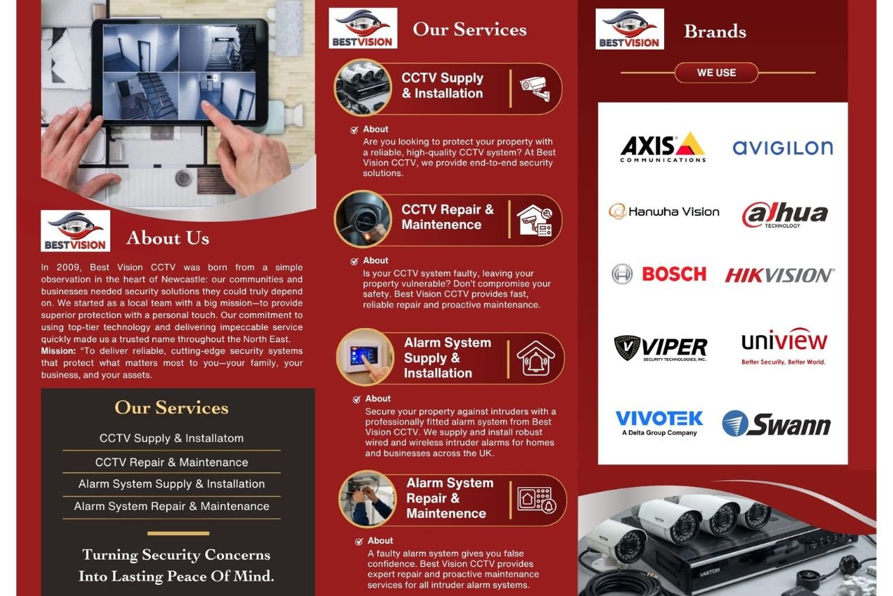 I designed a cohesive and professional marketing package for Best Vision CCTV, a leading UK provider of security and alarm systems for homes and businesses. The project included a comprehensive brochure, a promotional flyer, and a Facebook cover, all unified by a clean, trustworthy aesthetic that reflects the company’s commitment to reliability and cutting-edge security.