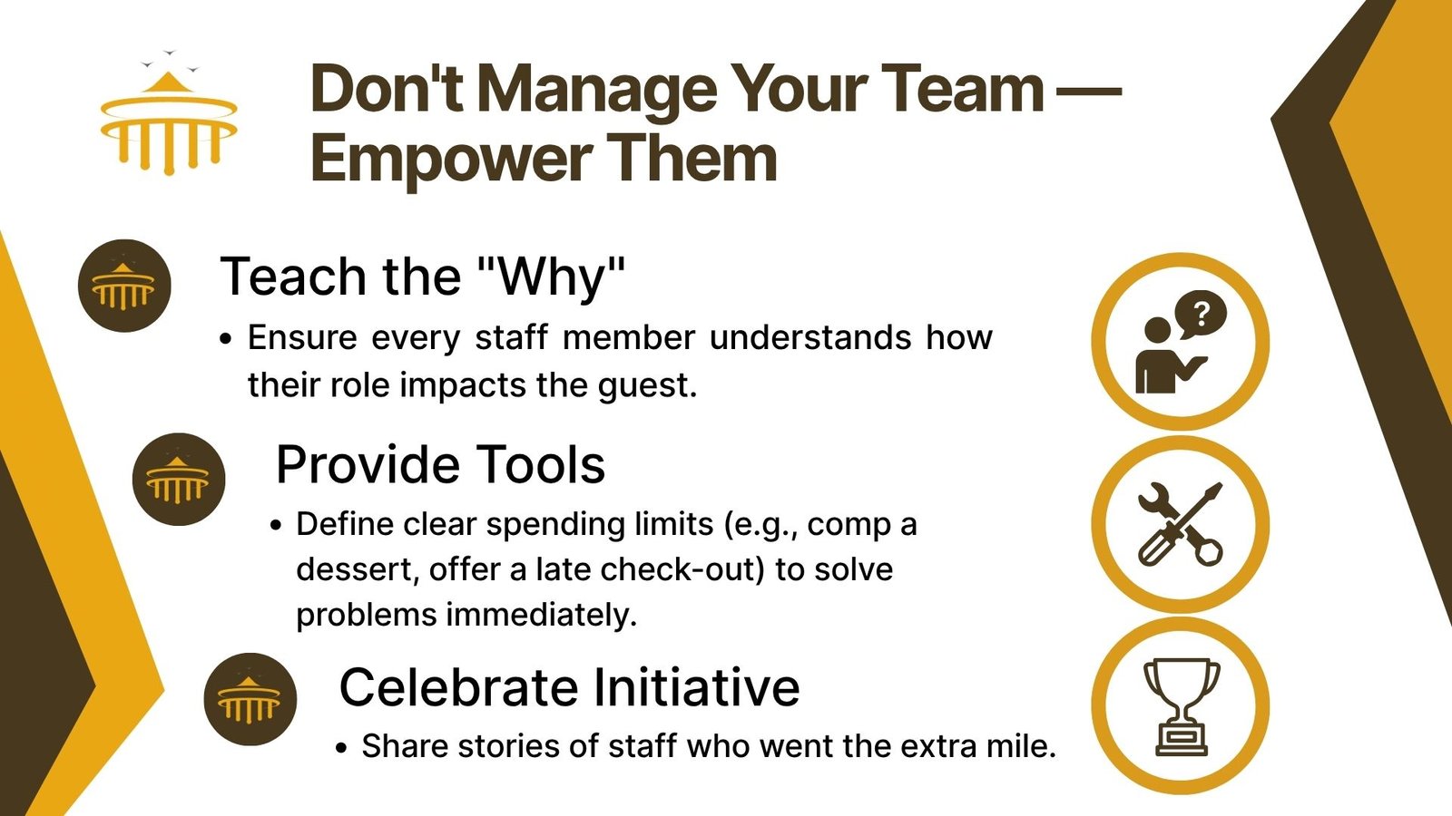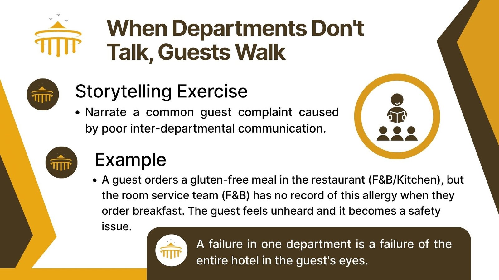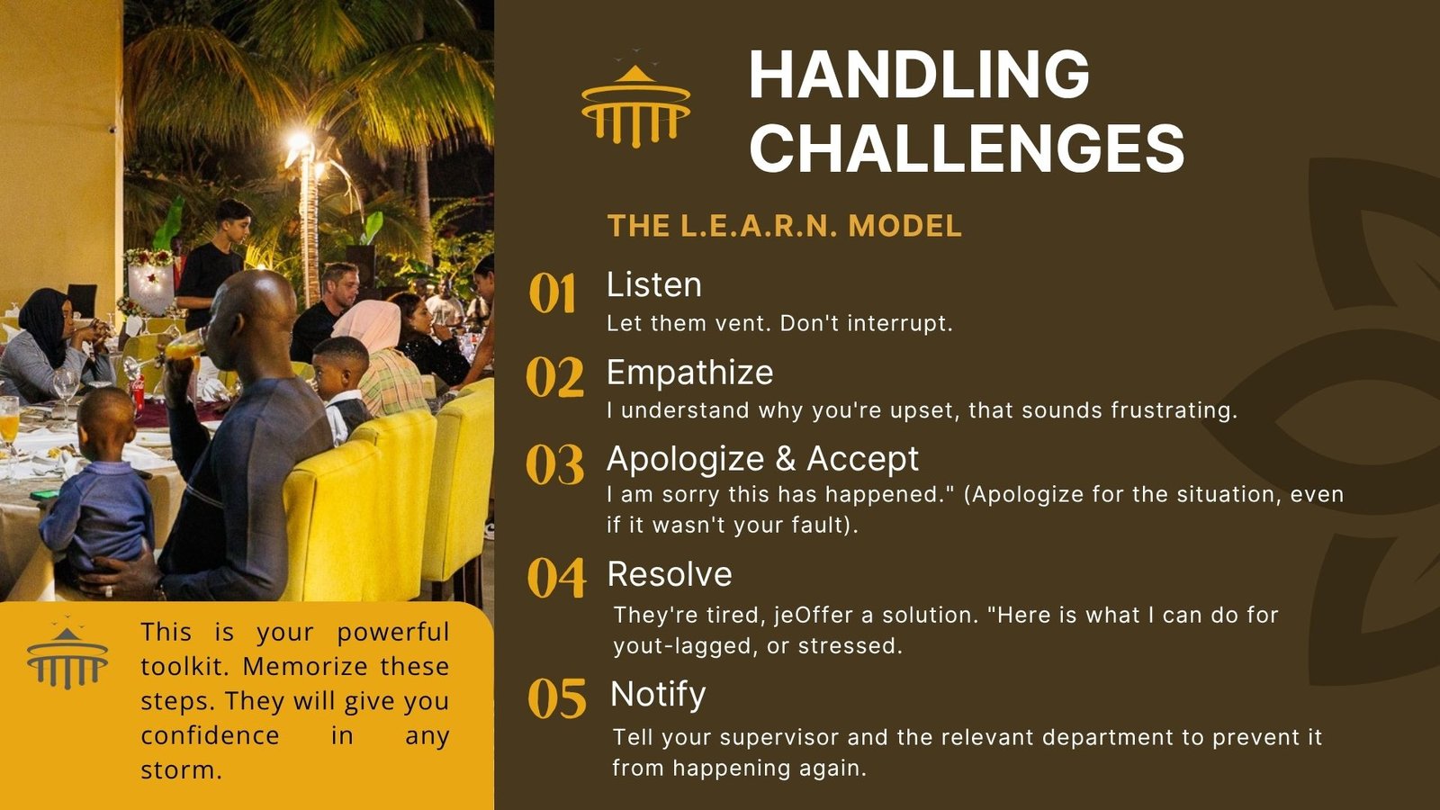 The program moved beyond operational basics to focus on high-impact leadership principles, including mapping the modern guest journey, breaking down departmental silos, and fostering a culture of collaboration. It featured advanced modules on active coaching, team empowerment, leveraging technology for seamless communication, and a deep-dive analysis of each department’s role in the service chain. Through interactive exercises, strategic action planning, and the L.E.A.R.N. model for handling challenges, the presentation empowered supervisors to lead by example and drive continuous improvement.