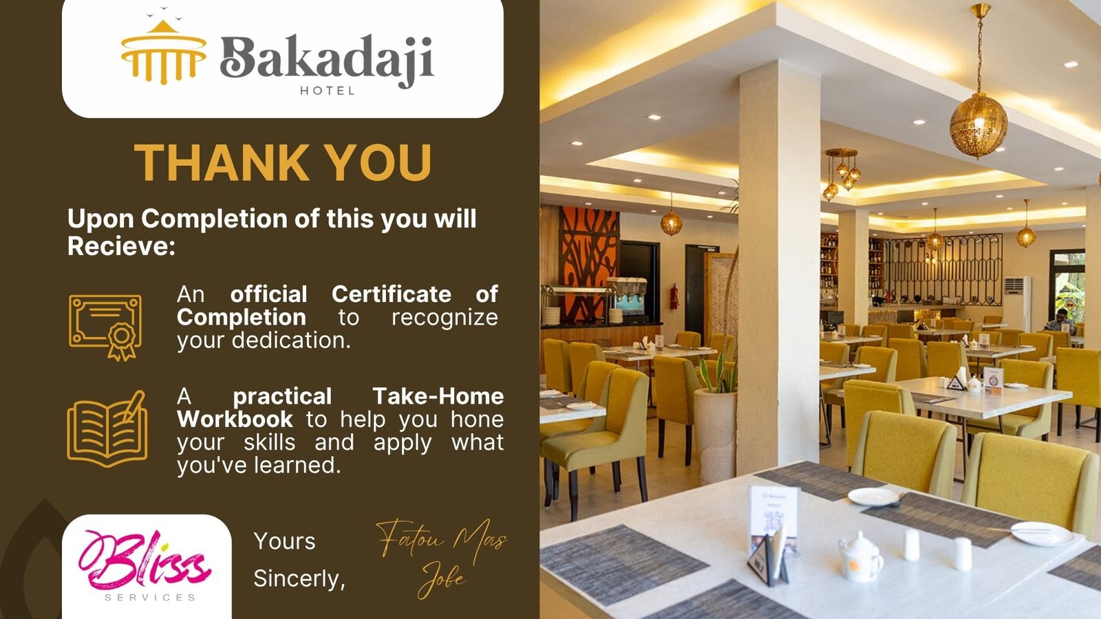 I designed and developed a specialized leadership training program for the supervisory team of Bakadaji Hotel, the premier four-star eco-friendly property along Bertil Harding Highway. Titled “Enhancing Guest Experience & Exceptional Service Delivery,” this comprehensive curriculum was strategically crafted to equip Heads of Departments with the skills to become architects of the guest experience.